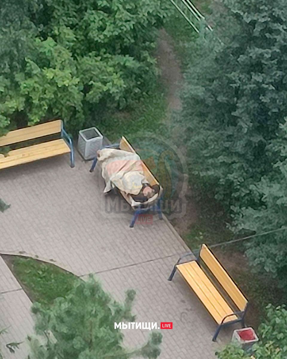 ➡️Мытищи, ул. Индустриальная, 3к3. Жители утром заметили во дворе мужчину, который мирно спал на скамейке. Судя по подушке и одеялу, к ночёвке он подготовился заранее.