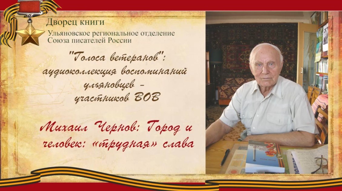🎖Проект «Голоса ветеранов»: выпуск шестой 🎧Продолжаем проект, главная цель которого - создать аудиоколлекцию воспоминаний ульяновцев - участников Великой Отечественной войны. 📎 Шестой выпуск посвящен Чернову Михаилу Васильевичу - жителю Ульяновска, участнику ВОВ. Ветеран многие годы по крупицам собирал сведения об участии и роли ульяновцев в победе над фашистами. СЛУШАТЬ АУДИОИНТЕРВЬЮ 📖Читайте очерк о М.В. Чернове: vk.cc/cOkTZu ❗️К 80-летию Победы Дворец книги инициировал создание аудиоколлекции воспоминаний, связанных с Великой Отечественной войной, - в рамках регионального проекта «Годы войны – века памяти». Со всей аудиоколлекцией можно ознакомиться на сайте Дворца книги Веб-ресурсе регионального отделения Союза писателей России, а также на сайте прозы и поэзии Ульяновской области Ул-Литка Инициатива реализуется в рамках проекта Дворца книги и регионального отделения Союза писателей России "Глубинные интервью" и ведомственного проекта Министерства культуры РФ «Гений мест