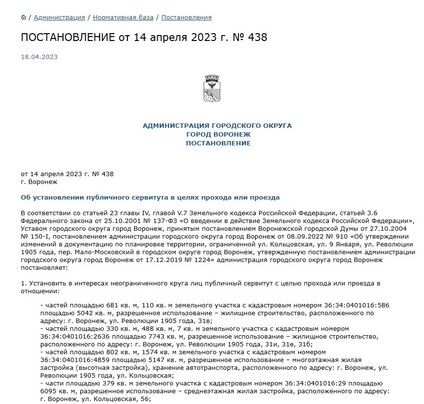 В 2023 году мэрия Воронежа опубликовала постановление за подписью тогдашнего главы города Вадима Кстенина, которое установило публичный сервитут по территории ЖК (придомовая территория дома 31а по улице Революции 1905 года). Таким образом, благодаря сервитуту, дети могли бы безопасно дойти до стадиона дворами, не приближаясь к проезжей части. Это видно на схеме, которая есть в распоряжении «Блокнот Воронеж». На ней показано что есть и альтернативный путь к стадиону — в обход (зеленым цветом). Но в этом случае школьникам придется идти вдоль ож