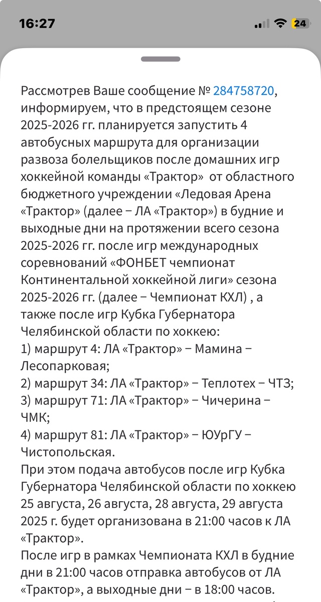 После домашних игр челябинского «Трактора» болельщиков развезут спецавтобусы, передает корреспондент Агентства новостей «Доступ». Об этом сообщается в паблике «Челябинский транспорт». В дни матчей будут продлены маршруты четырех автобусов: № 4 от ЛА «Трактор» до улицы Мамина и далее до улицы Лесопарковая; № 34 ЛА «Трактор» через Теплотех и до ЧТЗ; № 71 ЛА «Трактор» через улицу Чичерина до ЧМК; № 81 ЛА «Трактор» через ЮУрГУ до улицы Чистопольская. После игр Кубка Губернатора, которые пройдут 25, 26, 28 и 29 августа, автобусы будут ожидать болельщиков у Ледовой арены в 21:00. После других игр в рамках чемпионата КХЛ – в 21:00 по будням и в 18:00 по выходным.