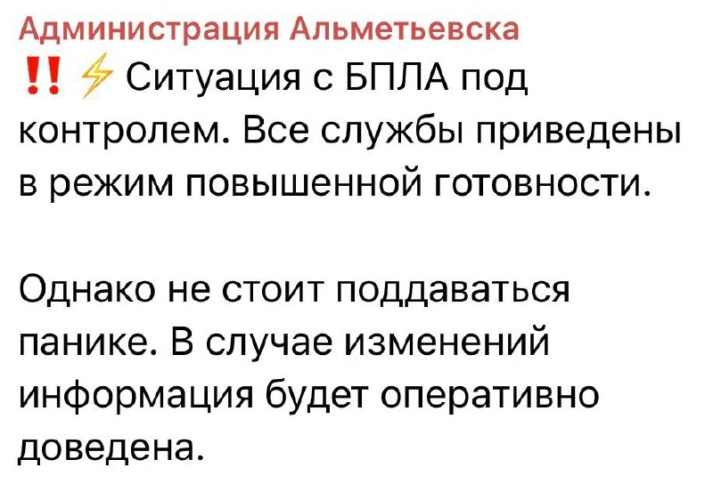 В ответ на пост ❗️🛩 В Альметьевске экстренные службы привели в режим повышенной готовности из-за угрозы БПЛА Администрация Альметьевска сообщила, что ситуация находится под контролем. Жителей призвали не поддаваться панике и пообещали оперативно информировать об изменениях. @tatmediaofficial | Все каналы Татмедиа