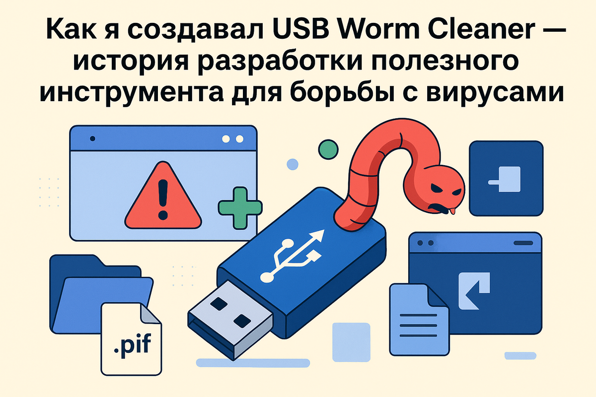 Несколько месяцев назад я столкнулся с неприятной ситуацией — после подключения флешки к компьютеру начали появляться странные файлы, а антивирус молчал. Как оказалось, это был классический USB-червь, распространяющийся через файлы .pif и папки Winset. Стандартные антивирусы часто пропускают такие угрозы, поэтому я решил создать собственное решение. Так родился USB Worm Cleaner — скрипт для автоматического поиска и удаления подобных вредоносных программ.