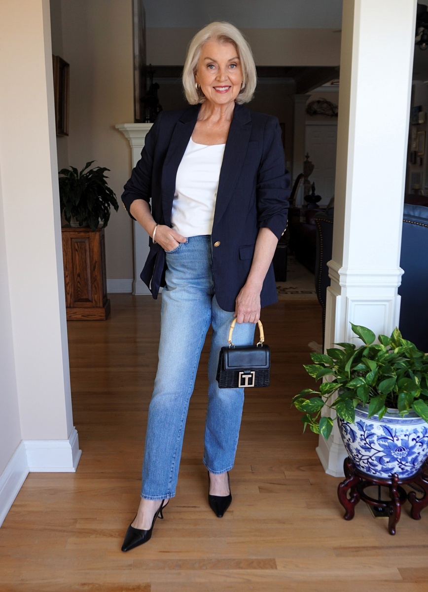 Осень – это время перемен, уютных вечеров и, конечно же, обновления гардероба. Для женщин старше 60 лет это прекрасная возможность подчеркнуть свою зрелую красоту, элегантность и индивидуальность. В этой статье cобрала 12 современных образов, которые помогут вам элегантно встретить осень, сочетая комфорт, стиль и актуальные тенденции. Светлые джинсы и белая майка визуально освежают ансамбль. Темно-синий жакет – это вечная классика, которая всегда уместна. Черные туфли-слингбэки и черная сумка с контрастной ручкой добавляют элегантности и утонченности в образ! Красный жакет в стиле Шанель – это смелый, но очень стильный выбор, который привлекает внимание и придает уверенности. Классические брюки – это беспроигрышный вариант. Светлая сумка под крокодиловую кожу добавляет текстуры и дороговизны, а черные лодочки – классическое завершение наряда, которое никогда не выходит из моды. Сочетание белых джинсов и голубой рубашки – это всегда свежо и весенне, даже осенью. Темно-синяя кофта доба