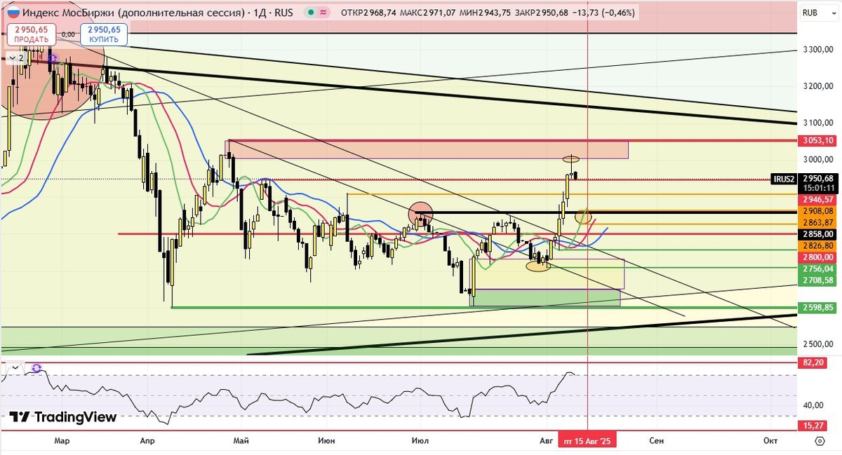 🏦 #Индекс_ММВБ ТФ 1Д Индекс мосбиржи корректируется в ожидании встречи на Аляске. После безоткатного роста с начала августа на 11%. вполне ожидаемо, что многие инвесторы захотят зафиксировать полученную прибыль. Тем более, что вокруг предстоящей встречи Трампа и Путина, очень много спекуляций и вбросов. Прагматичные и уже привыкшие к "двуличности" запада российские дипломаты, очень сдержанны в оценках перспектив и не питают иллюзий. Так же настроены и инвесторы. Украина и Европа всеми правдами и неправдами пытаются сорвать переговоры, уговаривая и нашептывая Трампу, а в какие-то моменты даже пытаются его пугать. Благо, что Трамп уже в таком возрасте, когда он на утро не помнит, что сказал вечером, поэтому он не взирая на уговоры, "едет в Россию". Ждём! __________ 📈 Технически индекс пока идет в рамках сценария и с утра уже находится на первой поддержке, на уровне 2950 пунктов. Следующая поддержка 2900, ниже 2860. Будем надеяться, что до пятницы не произойдет ничего, что могло