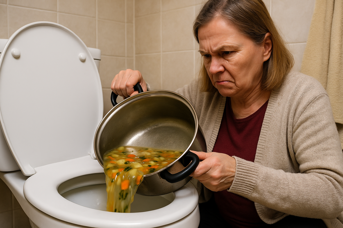 Тамара Петровна уже была у унитаза, перевернула кастрюлю, и суп полился — тёплый, ароматный, с кусочками овощей, которые я так тщательно выбирала, — исчезая в водовороте смыва.