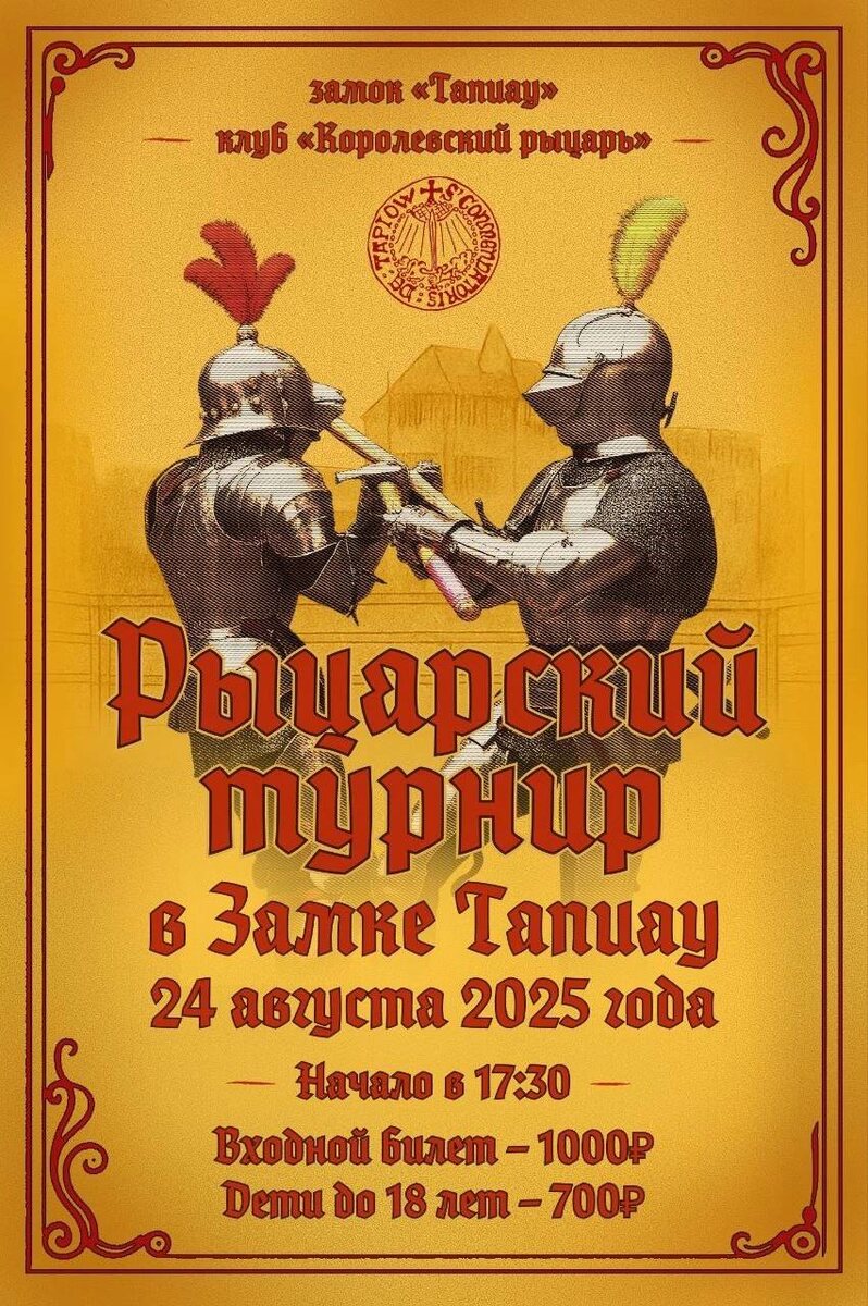 Привет, на связи Валера! Ну что, седлайте мечи и точите коней — везу вас в Средневековье! 24 августа я паркуюсь у замка Тапиау, и мы с вами шагнём в XV век. Представьте: блестящие доспехи, звон мечей, благородные рыцари и прекрасные дамы… и это не кино — всё по-настоящему! ⚔ Настоящий турнир по историческим правилам — клуб «Королевский рыцарь» покажет, как сражались 500 лет назад. 💃 Танцы «Два прихлопа, три притопа» — будете притопывать даже если пришли просто посмотреть. 🏹 Лук, арбалет, конь по имени Рой — и всё это можно попробовать! 🍗 Угощения от аустерии «Великое Посольство». 🔥 Финал — огненное шоу, от которого я сам чуть не подплавлю бампер! Шучу, это безопасно 😉 Билеты можно приобрести в кассе замка Тапиау, Билеты на рыцарский турнир в замке Тапиау, 24 августа 2025 - Калининградская обл., г. Гвардейск, ул. Дзержинского, 12. Телефон: 8 (401) 237-45-15 или по ссылке Qtickets Афиша 👉 kaliningrad.qtickets.events/180347-ryt Стоимость: ✅ Билет - взрослый билет 1000 рублей, де