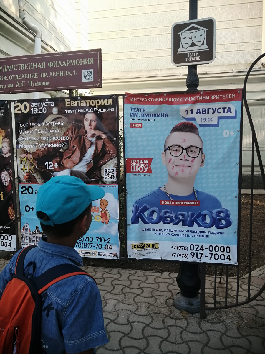 Как мы на концерт ходили... Начало задерживалось,пришлось прогуляться по Театральному бульвару и улице Дувановской к морю...Не очень приятно,вечером уже темновато домой добираться. Театральный бульвар-красивое место в центре Евпатории. Далее идём по старинной улице со старинными домами. Мимо этого дома в архитектурной эклектике,с фигурой женщины наверху,невозможно пройти. Из его истории.В 1916 году на улице Пушкина появляется здание, которое вошло в историю города под названием его первого хозяина как «дом Серая Шапшала». Четыре года владел домом Серая Шапшала. В 1920-х годах с установлением советской власти все религиозные учреждения и их проповедники подверглись преследованиям. Впоследствии дом был национализирован и переоборудован под жилой. Времени достаточно,чтобы полюбоваться на творения местных художников.Честно сказать,что нам более котик понравился с зелёными глазами!) Обратили внимание на скульптуру,как из детских советских книжек-Ильич с детьми . Это территория детско