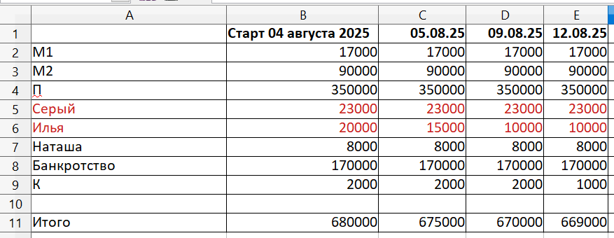 Красным выделены долги особенно срочные, но я решила сегодня внести 1000 на самый маленький долг, строчка освободится.