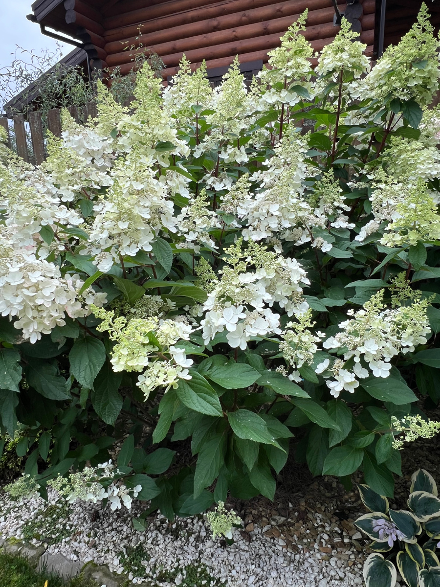 Это одни из лучших старых сортов. Сейчас много всего нового появилось среди метельчатых Гортензий, но старая гвардия вне конкуренции. Это два проверенных временем сорта. Не замерзают, не попадали ни разу под возвратные заморозки, цветут каждый год обильно. Пинки Винки. Пинки Винки знают почти все, наверное В начале цветения белоснежные свечки хороши. Рост у нее заявлен разный, до 200 см. У меня три куста Пинки Винки и все разной высоты. Вот этот куст самый высокий из трех - 225 см. Догоняет Лайм Лайт. Почему такая разница между кустами - не знаю. Люблю их одинаково)) А самый низкий из трех - 180 см Ширина любого куста зависит от вас. Если надо сделать уже, а мне уже надо видимо, просто отрезаете все боковые лишние побеги. Ширина моих кустов ( по кроне) -170 см, 150 см. Стволы бордовые, листья темные, острые. Но она узнаваема и так своими острыми пиками и крупными цветами. Если клещ решил пообедать гортензиями, то ее и еще некоторые сорта, по каким-то причинам облетает мимо. С этим сорт
