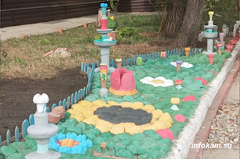 Это позволило и грунт укрепить, и от вездесущего песка с пылью избавиться. Камни окрасили, и наполнили «лужайку» жизнью: создали цветы и фонтаны-имитации. В одном из «фонтанов» даже поселили уточку.