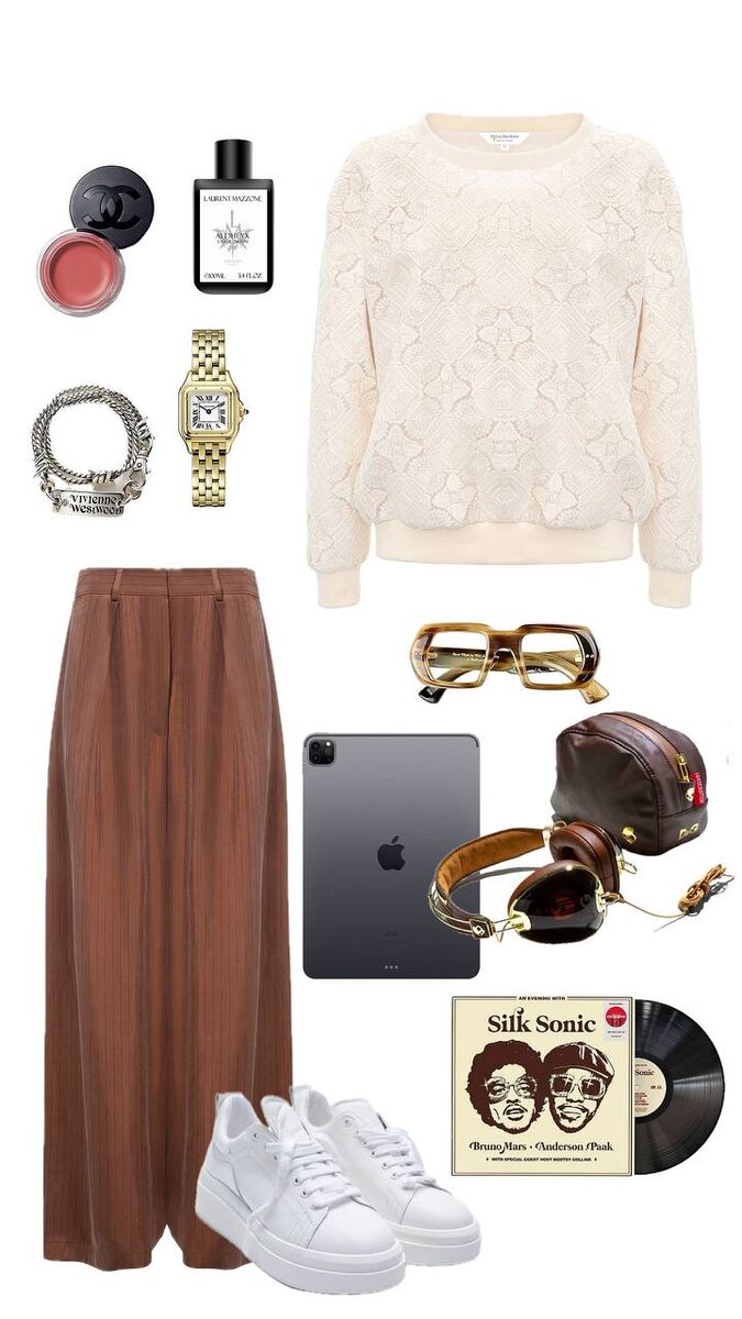 TODAY’S FIT Свитшот из молочного кружева с мелкими пайетками Lullaby Брюки из струящейся вискозы Smooth criminal beige и все то, что наполняет вашу душу гармонией, умиротворением и выравнивает эмоционально.