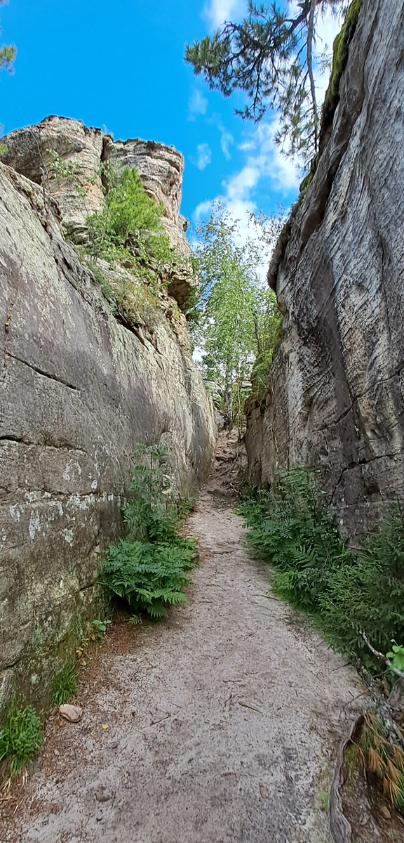 Мы с мужем оба родились и до 30 лет жили в Перми, но родной Пермский край толком и не видели. Теперь же, приезжая в гости к родителям, стараемся посетить все достопримечательности нашего красивейшего края. Этим летом мы сгоняли на машине в Каменный Город. В городе никто не живёт, по сути это просто нагромождение скал с переходами, похожими на улицы. Находится он в Губахинском районе Пермского края, дорога до самого Каменного Города хорошая, асфальтовая. По пути тоже много чего красивого можно увидеть - бескрайние леса, реки. Есть смотровая площадка после отворота на Гремячинск, но мы пролетели мимо неё на большой скорости. Сам скальный массив города образовался из дна большой реки несколько сотен миллионов лет назад. Тогда эта река впадала в Пермское море. Позже породы окаменевшего древнего русла в результате тектонических процессов поднялись вверх и между песчаниками образовались глубокие трещины и пустоты. С течением времени мороз, ветер и перепады температур сделали своё дело