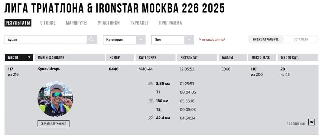 10 августа в Москве прошли соревнования ЛИГА ТРИАТЛОНА & IRONSTAR 2025. Среди участников под номером 0446 на дистанцию вышел бывший глава города Курска Игорь Куцак. На "железной" дистанции участникам предстояло проплыть 3,86 км, затем проехать на велосипеде 180 км, далее - бег (42,4 км). Игорь Куцак выполнил все за 12 часов 5 минут и 52 секунды. Данные имеются на официальном сайте соревнований. Напомним, что в июле прошлого года Игорь Куцак преодолел "полужелезную" дистанцию на на состязаниях "Медный всадник" в Санкт-Петербурге.