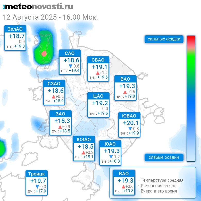 В 16:00 в Москве было от +18°C до +20.3°C, средняя температура +19.1°C #погода #Москва #лето #температура #12августа #вторник
