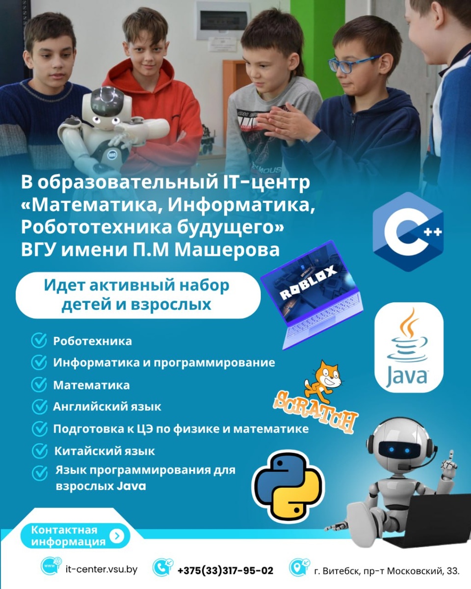 💻В образовательный IT-центр «МИР будущего» ВГУ имени П.М Машерова идет активный набор детей и взрослых! Занятия проходят на базе факультета математики и информационных технологий. Все занятия проводят опытные преподаватели, доценты, кандидаты наук, преподаватели-тренеры, занимающиеся подготовкой обучающихся к олимпиадам по информатике, математике, физике и робототехнике. 🔵Учебным планом предусмотрено 56 часов, 28 занятий (по 2 часа в неделю). Начало занятий – сентябрь. Стоимость 1 курса (за год) – 350 рублей. 📞Контактная информация: +375 (33) 317-95-02. #анонсы