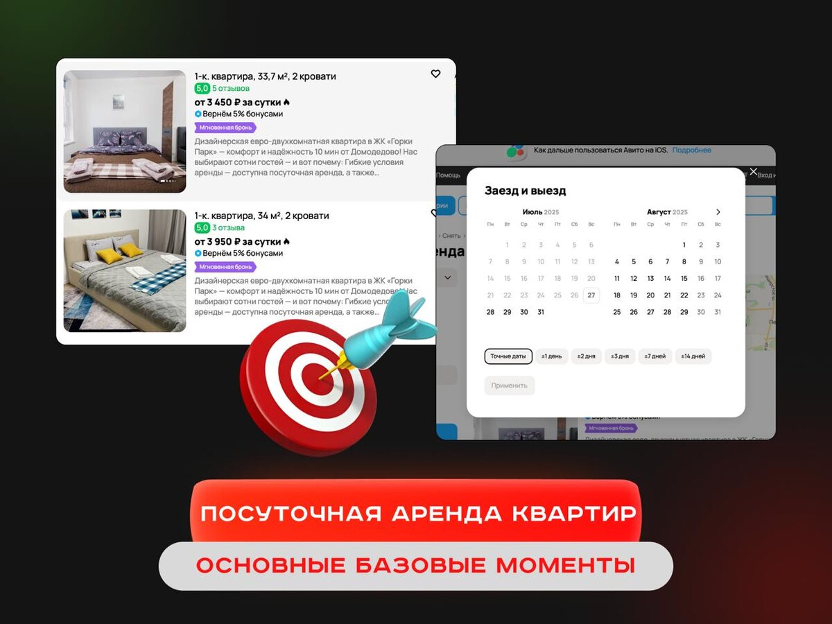 Не давно помогал с запуском проекта в данном направлении и решил заострить внимания на базовых деталях на что стоит обращаться пристальное внимание при запуске, так вот: Хорошая ниша с отличным спросом и большой конкуренцией. Чтобы ваше объявление не затерялось среди сотен других — важно правильно его оформить. Без обходов модерации и сложных схем — чисто только базовые, но важные детали 👇 📸 Фотографии — продают первыми — Снимайте на хорошую камеру, лучше — с широким углом. — Максимум фото — до 40 штук, используйте это! — Покажите не только интерьер, но и дом снаружи, подъезд, вид из окна, бытовую технику и мелочи (постель, посуду, декор). — Добавьте ощущение уюта: свет, порядок, чистота. 📝 Описание — убирает сомнения — Укажите площадь, этаж, количество спальных мест, тип кроватей. — Перечислите все удобства: Wi-Fi, ТВ, кухня, балкон, стиралка и т.д. — Расскажите, что рядом: метро, ТЦ, парки, кафе. Это важно для тех, кто приезжает в город впервые. — Чётко пропишите правила: • минима