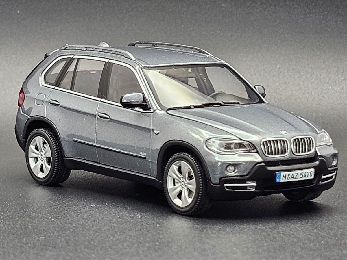 Фотообзор модели BMW X5 E70 2007 Grey metallic от компании AutoArt в масштабе 1/43. Сначала совсем немного о настоящем автомобиле. BMW E70 — среднеразмерный кроссовер класса люкс второго поколения BMW X5. Он пришёл на смену BMW X5 (E53) в июле 2006 года. Про модель Е53 в 43 масштабе - https://dzen.ru/a/aDb7Pff363qt4iBu?share_to=link. Он производился одновременно с BMW X6 на заводе BMW в Грире (штат Южная Каролина, США) и на заводе BMW в Толуке (Мексика). BMW X5 E70 стал на 60 мм шире, на 165 мм длиннее и с колесной базой, которая увеличилась на 110 мм, но остался на уровне высоты E53 X5 — 1766 мм. Обновления системы полного привода xDrive, представленные в обновлённом X5, продолжились в виде дополнительных улучшений для E70. В передней части используется двухрычажная подвеска. Механическая коробка передач не предлагалась, осталась только автоматическая. E70 оснащен множеством новых технологических достижений для этого класса в качестве стандартного оборудования, включая систему BMW i