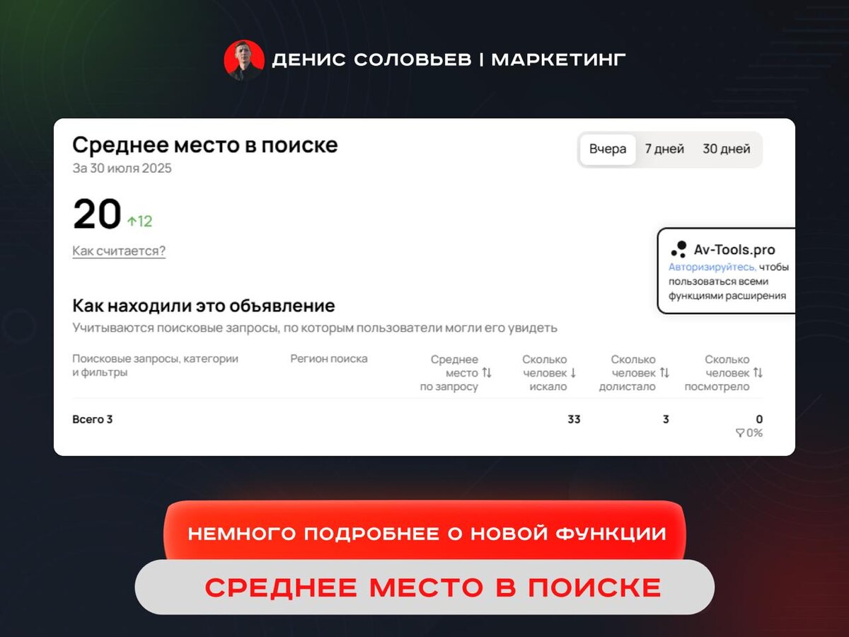 Более подробно о новом инструмент, который не так давно в тестовом режиме запостился на некоторых аккаунтах. 📌Как это работает? Авито анализирует реальные поисковые запросы (например, «iPhone 15», «смартфон», «телефон») и определяет среднюю позицию твоего объявления за 1, 7 или 30 дней. Данные обновляются ежедневно ночью. От чего зависит место? ✔️ Соответствие запросу — чем точнее описание, тем выше шанс быть найденным. ✔️ Качество объявления — хорошие фото, адекватная цена и заполненные параметры. ✔️ Продвижение — помогает занять более высокие позиции. ✔️ Репутация — активность и отзывы тоже играют роль. Что НЕ работает? ❌ Перепубликация объявления ❌ Заниженная цена ❌ Ключевые слова в описании (Авито их не учитывает) 📌 Зачем это нужно? Этот инструмент помогает контролировать позиции, улучшать тексты и вовремя настраивать продвижения, чтобы объявления стабильно были в топе. 📱 Подписаться на канал, тут много чего полезного 🙂 Только уникальный контент, без копипаста с других авитолог