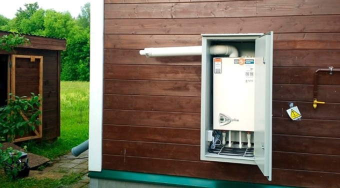Если внутри дома нет подходящего помещения, места для установки традиционного газового оборудования, можно установить наружный котел отопления. Прибор помещают в утепленный защитный корпус на улице рядом с домом.