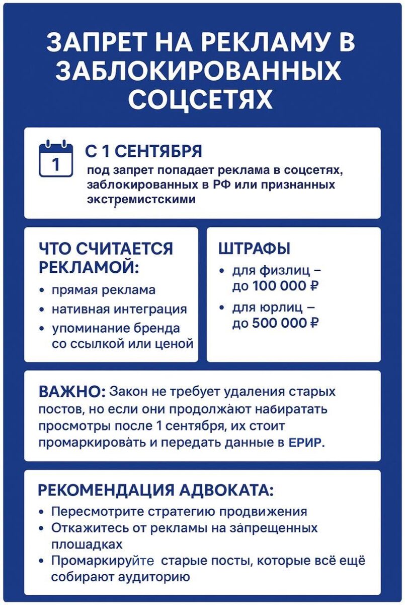 С 1 сентября в России действует запрет на размещение рекламы (включая интеграции) в соцсетях, заблокированных в РФ или признанных экстремистскими.