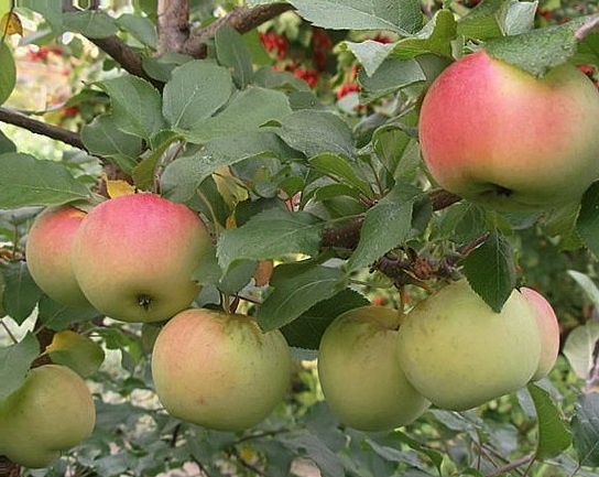 - Плоды: круглые, гладкие, жёлто-зелёные с насыщенным румянцем.