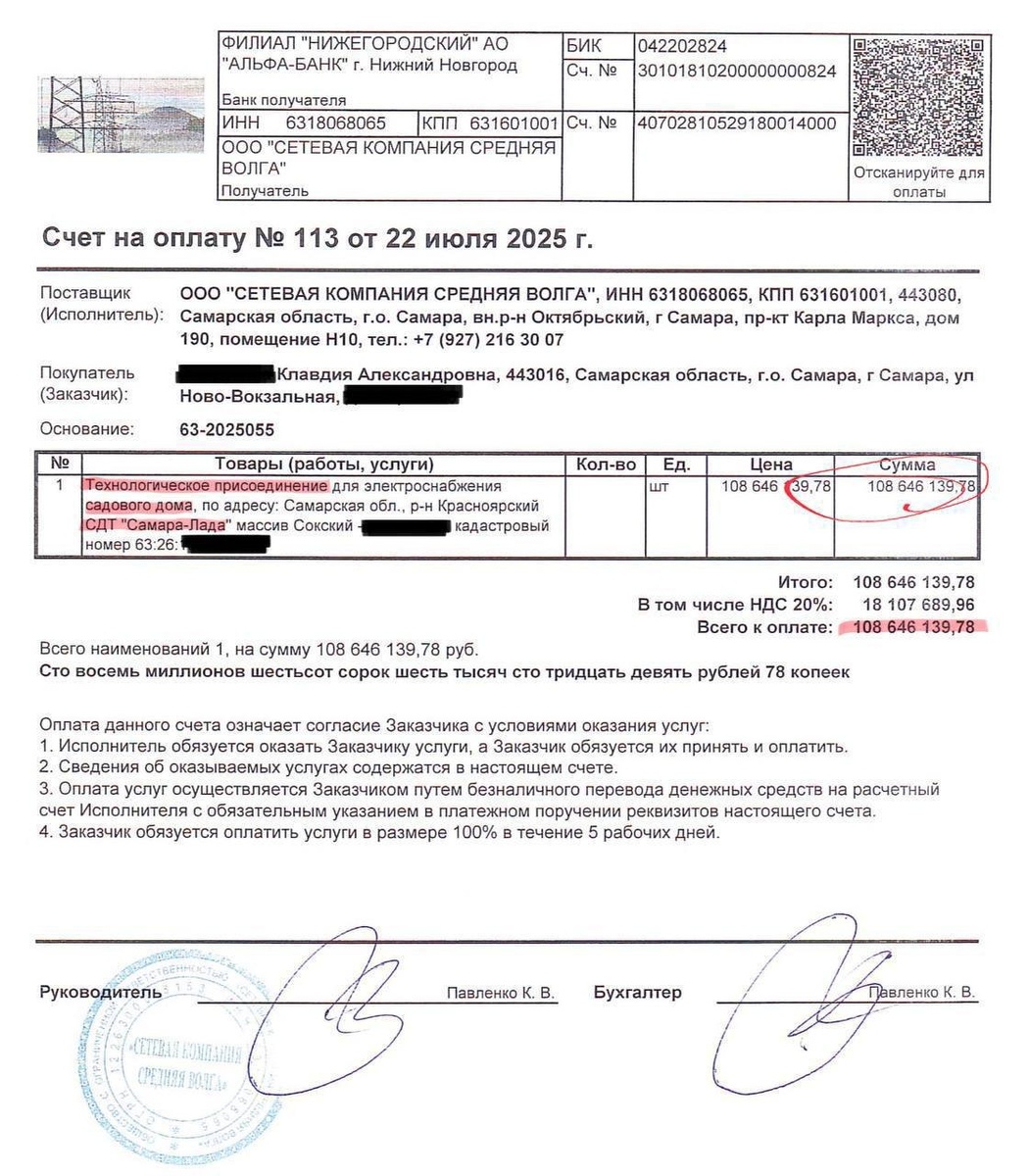 Пенсионерке из Самары выставили счёт на 108 миллионов рублей за подключение электричества к даче. Депутат Плякин опубликовал скан квитанции — цифры впечатляют.
