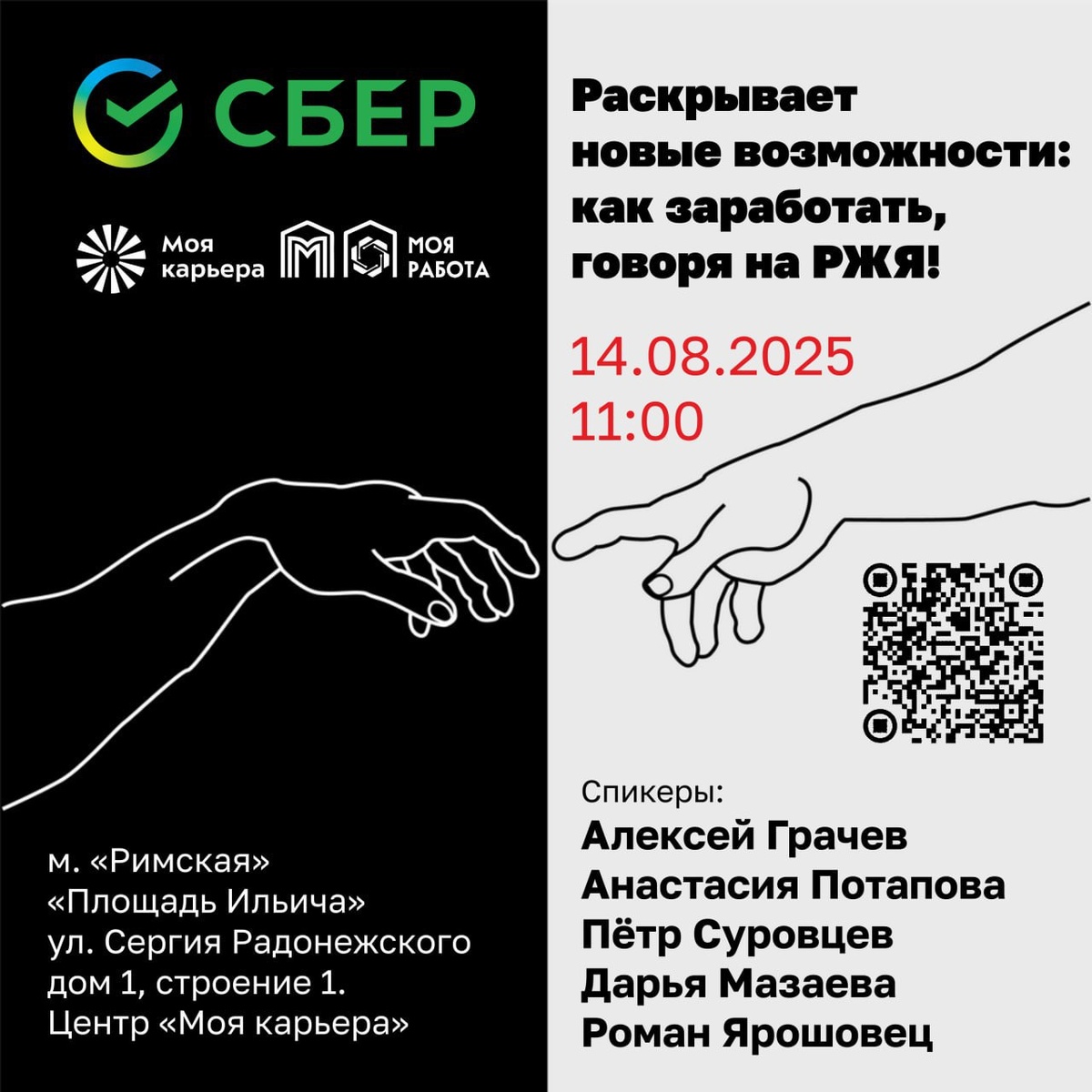 🏙🏙🏙🏙 📆📆📆 🔜 Как заработать, говоря на РЖЯ 🔵 В Москве состоится мероприятие от Сбера и службы занятости Москвы, где глухие и слабослышащие узнают о возможностях подработки для людей, владеющих русским жестовым языком (РЖЯ). 📌 Когда: 14 августа, четверг, 11:00 (МСК) Где будет проходить: Центр "Моя Карьера", ул. Сергия Радонежского, д. 1, стр. 1., м. Римская/Площадь Ильича *Важно* - встреча с переводом на РЖЯ - вакансии для 18+, проживание на территории РФ, владение РЖЯ, смартфон с камерой - - регистрация в службе занятости (процедура простая и быстрая, мы поможем разобраться) 🎙 Спикеры: • Алексей Грачев - уникальный карьерный эксперт службы занятости для неслышащих людей - расскажет о возможностях трудоустройства в службе занятости • Анастасия Потапова - заместитель руководителя в службе занятости - поможет пройти регистрацию • Пётр Суровцев - руководитель спецпроекта от Сбера — расскажет о заданиях, оплате и перспективах • Дарья Мазаева и Роман Ярошовец - участники проек
