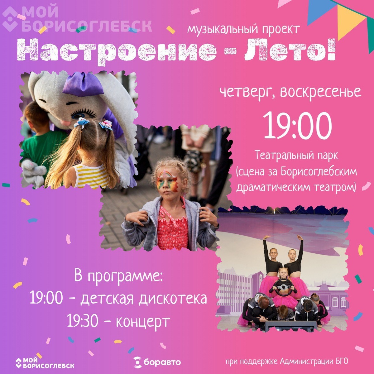 Друзья, четверг — ваш билет в лето и время для ярких впечатлений в рамках проекта «Настроение-лето!». Уже послезавтра, 14 августа, в 19.30, мы приглашаем вас на ретро-дискотеку в театральный сквер. Вас ждут танцы под любимые хиты и выступления талантливых артистов. Хотите стать частью этого музыкального праздника и выступить на сцене?! Мы с радостью дадим вам такую возможность. Если у вас есть талант к пению или танцам, запишитесь на ретро-дискотеку, позвонив по номеру 8-951-875-64-54 до 12.00 14 августа. Ждем всех желающих, независимо от места проживания. А в 19:00 — любимая детская дискотека. Не упустите шанс зарядиться позитивом и музыкой! Со всеми предстоящими событиями, которые пройдут в рамках «Настроение-лето!» и не только, знакомьтесь в календаре событий на нашем сате 👉 https://mybsk.ru/category/posters/