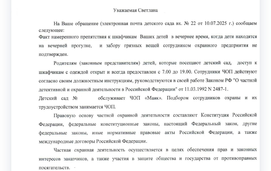 Я в полном возмущении в связи с полученным ответом из детского сада! Моя жалоба на недопустимую ситуацию с ограничением доступа к шкафчикам с грязной одеждой детей в вечернее время осталась без должного внимания. Как можно было не обнаружить нарушений? Неужели так сложно просмотреть записи с камер видеонаблюдения или прослушать записи домофонов? Неужели так трудно увидеть, как меня, словно преступника, водила от шкафчика к шкафчику охранница? Утверждая при этом, что пропадут вещи воспитательниц. Конечно же, я их стащу и убегу. Какие абсурдные обвинения! Это не просто несправедливо, это оскорбительно! Или обнаружили, но сделали вид, что не заметили? Почему так легко можно написать «нарушений не выявлено»? Такое поверхностное расследование в очередной раз показывает, как садик относится к решению проблем. Просто отписками! Да, после жалобы незаконные действия охранницы пресекли. Я спокойно забираю грязные вещи вечером. Но... прямо бесит! И только из‑за возраста охранницы я им это с