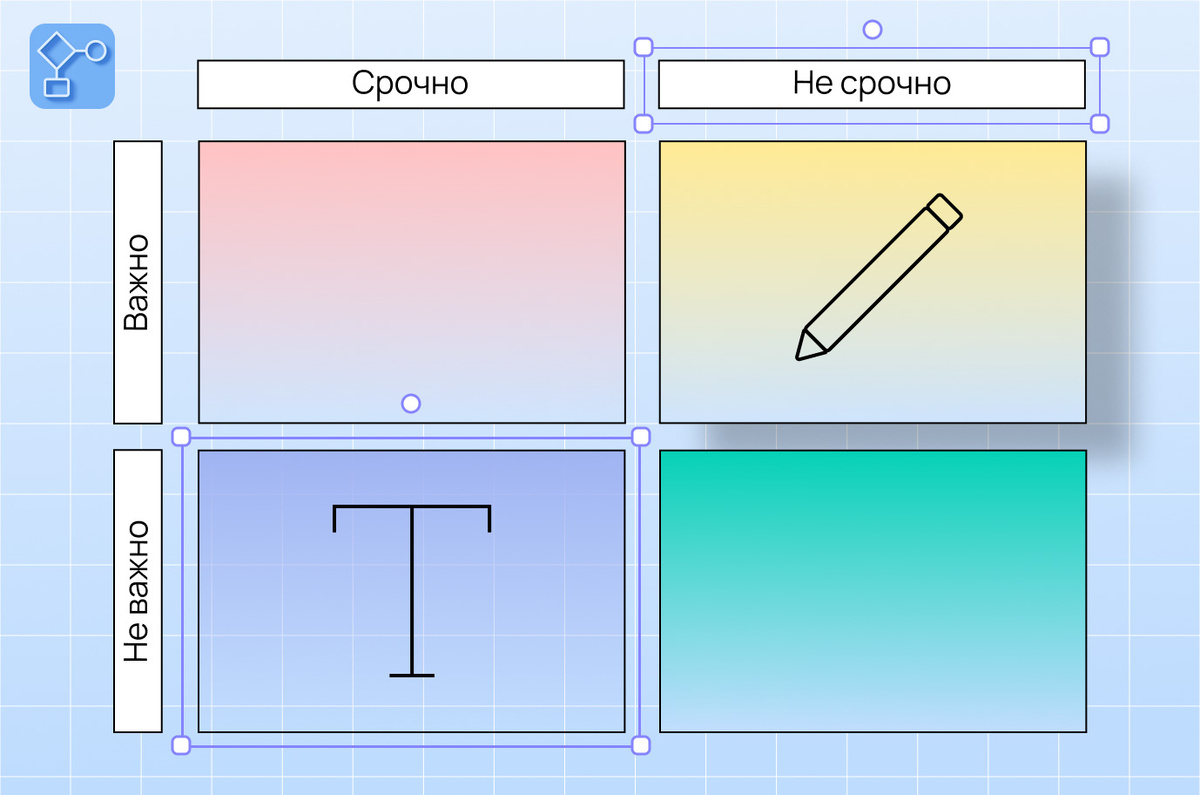 Матрица состоит из четырех квадратов: срочно и важно, не срочно и важно, срочно и не важно, не срочно и не важно. Часто их делают цветными и с пояснительными подписями. Для примера мы создадим матрицу Эйзенхауэра в МойОфис Схема – инструменте для визуализации при помощи фигур и блок-схем.