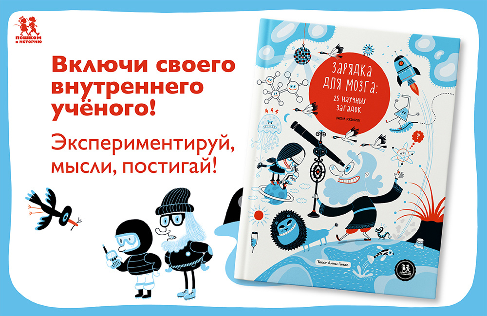 Напомним о нашей новинке для любителей головоломок. Зарядка для мозга: 25 научных загадок. Любите ли вы логические загадки и детективы? Тогда вам сюда! В книге «Зарядка для мозга» каждая загадка связана с каким-то законом или явлением природы, и чтобы ее отгадать нужно выявить научный принцип. Все загадки в этой книге требуют эрудиции, логики и научного подхода. И, конечно, позволяют как следует «прокачать» умение рассуждать, помогают на живых примерах запомнить законы природы, провести опыты и создать научные модели. Ответы на эти и многие-многие другие вопросы вы сможете самостоятельно найти с помощью этого великолепного эспандера для мозга! (Да, вопросов намного больше 25 – к каждой детективной истории есть ещё дополнительные задания.) А прекрасные иллюстрации только на первый взгляд мешают сосредоточиться – до того они смешные. На самом деле, внимательный глаз Шерлока Холмса найдёт в них множество подсказок… Разгадывать научные загадки можно не только в одиночку, но и с друзьями