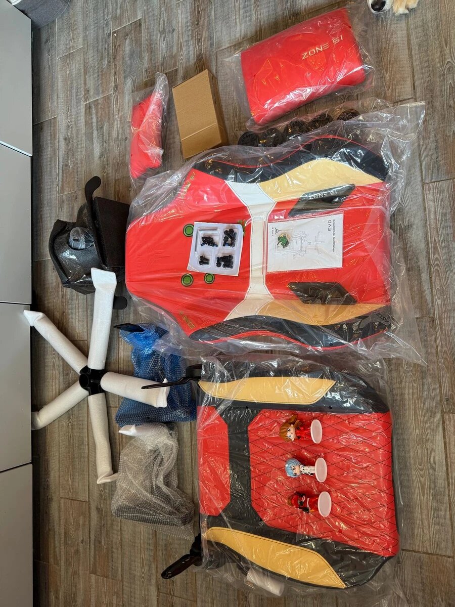 Дизайн кресла — его главная фишка. Вдохновленное EVA-02, оно выполнено в красном цвете с черными и желтыми акцентами, повторяющими палитру брони того самого робота, которого пилотировала одна из самых симпатичных главных героев в аниме. Контрастные швы, вышивка с логотипом Zone 51, номером 02 и стилизованными глазами “Евы” на спинке создают ощущение, будто вы в Entry Plug — капсуле управления Евой. Все мелкие детали на кресле выполнены максимально аккуратно, тут никаких претензий не имею. В комплекте еще идут коллекционные фигурки неплохого качества, которые не зазорно поставить на полочку.