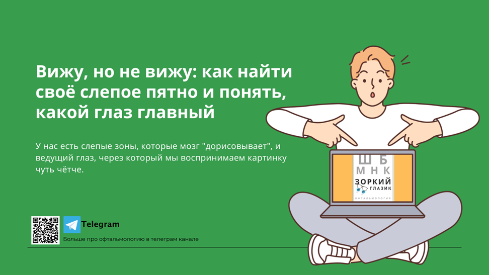 Мы редко задумываемся о том, что видим мир не одинаково каждым глазом. У нас есть слепые зоны, которые мозг "дорисовывает", и ведущий глаз, через который мы воспринимаем картинку чуть чётче. Оба эти эффекта легко проверить дома - это займёт пару минут. Представьте, что у вашей камеры есть маленькая область на матрице, которая ничего не записывает. Она просто «молчит» и не передаёт информацию. В нашем глазу есть такой же участок - это и есть слепое пятно. Оно находится там, где зрительный нерв (толстый «кабель», передающий сигнал в мозг) подключается к сетчатке - внутренней «плёнке» глаза. В этом месте нет светочувствительных клеток, которые улавливают изображение. Поэтому часть картинки просто выпадает. Почему же мы не видим в жизни чёрное пятно? · Наш мозг - отличный монтажёр. Он «дорисовывает» недостающую часть, опираясь на то, что видит вокруг. · Например, если в этой зоне была синяя стена, мозг закрасит её синим; если там идёт линия - он продолжит её. Это удивительное свойство мозг