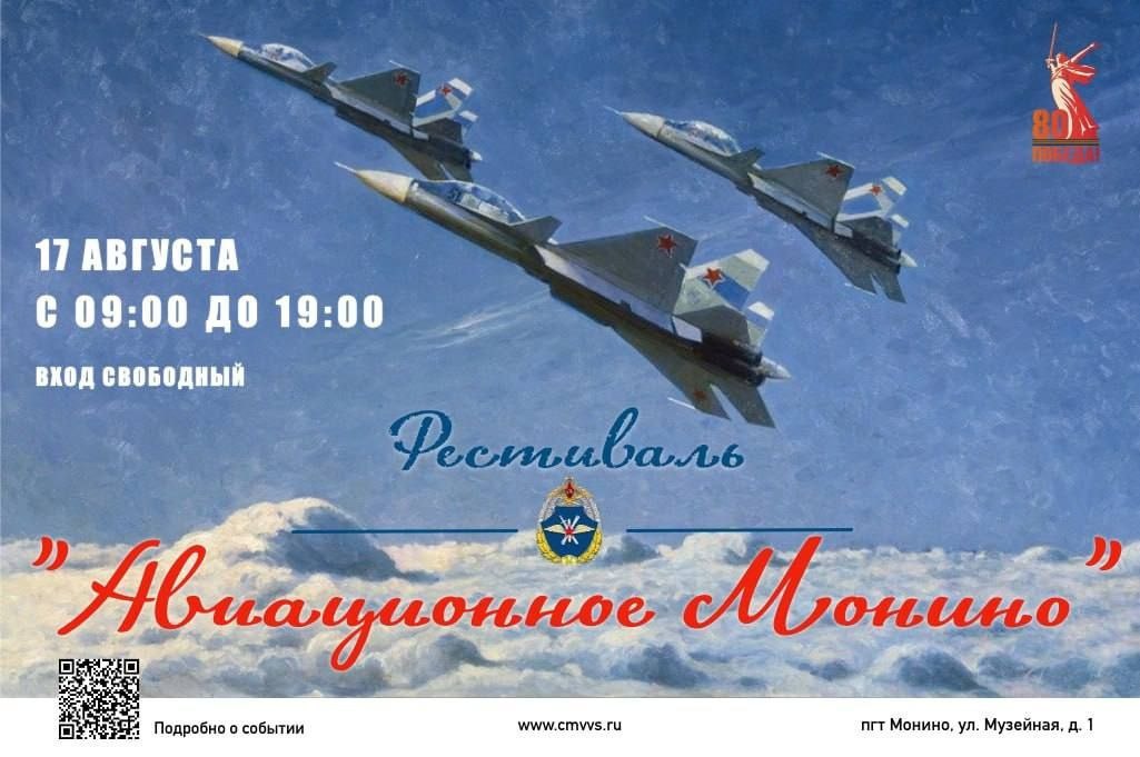 17 августа в музее ВВС в Монино состоится фестиваль «Авиационное Монино», посвященный Дню Воздушного Флота России! В программе фестиваля на открытой стоянке музея: 🌟Авиамодельная программа «Живущие небом», показательные выступления радиоуправляемых моделей; 🌟Выставка ретро автомобилей (Московский автоклуб «Волга-21» и клуб «Хаммер»; 🌟Показательные выступления личного состава спецподразделения ОДОН имени Ф.Э. Дзержинского; 🌟выступление участников фестиваля «Спасская башня» оркестра ОДОН имени Ф.Э. Дзержинского и ансамбля ударных инструментов (барабаны), г. Электросталь; 🌟Выставка БПЛА и робототехники МЧС; 🌟Выставка вооружения времен Великой Отечественной войны (пулемет Дегтярева, винтовка Мосина, ППШ, гранаты, Вальтер, Маузер, шашки); 🌟мастер-класс по тактической доврачебной медицинской помощи. На летней концертной площадке музея: 🌟Выступление Казачьего ансамбля «Кладезь», г. Щелково; 🌟Выступление артистов Центрального офицерского клуба ВКС; 🌟Выступление артистов Центр
