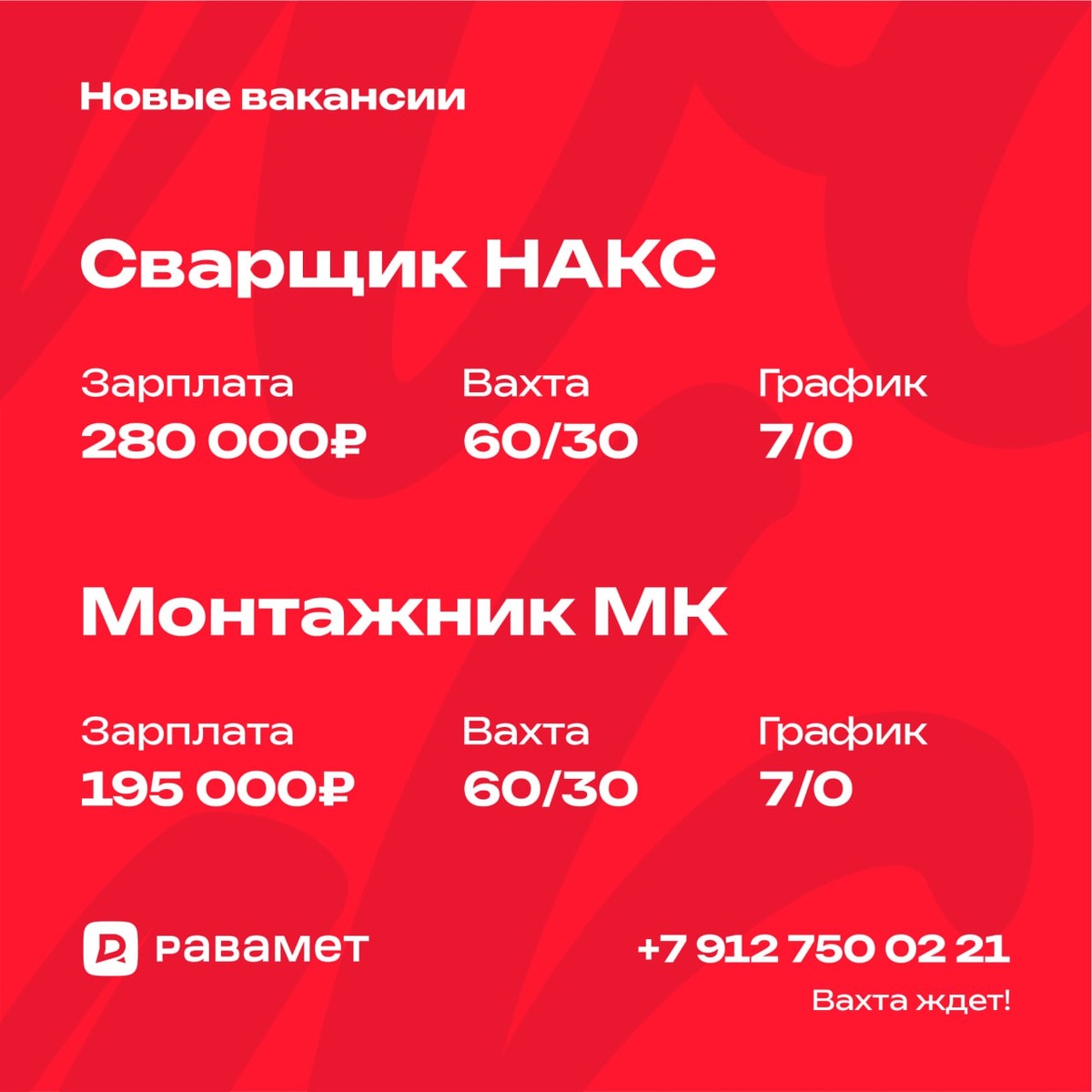 🚨 Сварщик НАКС и Монтажник МК 👍 Проверено командой Равамет 🔩 Сварщик НАКС 💰 220 000 ₽ 🏗 Монтажник МК 💰 160 000 ₽ Условия для обеих вакансий: 🕒 Вахта 60/30, смены 11 часов, 7/0 🏠 Проживание в общежитии 🍽 3-разовое питание — бесплатно 👕 Спецодежда за счёт компании 🚌 Трансфер до объекта организован ✈️ Проезд до 15 000 ₽ — компенсируем 💬 Как откликнуться? — Оформите резюме через Telegram-бота 👉 @ravamet_bot — Напишите в Telegram с пометкой «ВАХТА» 👉 @ravamet Хороший заработок и комфортные условия ждут вас! Для связи: +79199101100