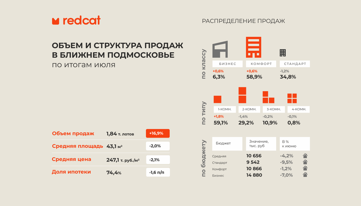 В июле спрос в ближнем Подмосковье также существенно вырос, но темпы прироста оказались скромнее, чем в остальных локациях московского региона. Так, за июль объемы продаж выросли на 16,9% и составили 1,84 тыс. лотов, отойдя от минимальных значений мая-июня. По сравнению с продажами июля прошлого года, текущие показатели выше на 10,3%. В июле рост спроса отмечен в 8 локациях, наиболее существенный прирост наблюдался в Реутове (+106,7%), Мытищах (+33,2%), Красногорске (+26,3%), снижение спроса зафиксировано в Люберцах (-20,0%), Долгопрудном (-16,4%) и Королеве (-2,4%). В июле, за счет активизации продаж в Мытищах, город снова нарастил свою долю в общей структуре и усилил свою лидирующую позицию среди городов-спутников. Сейчас 27,1% всех продаж ближнего Подмосковья сконцентрировано в Мытищах, второе место удерживает город Видное (15,9%), третье с минимальным отрывом занял Красногорск (15,7%). В июле структура спроса в разрезе классов жилья сместилась в сторону более дорогих проектов, в аб