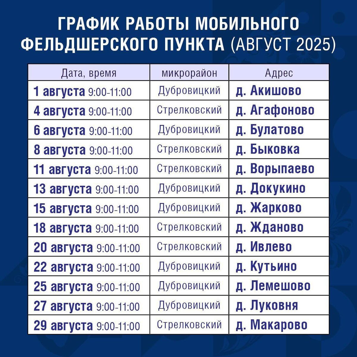 ✨ Диспансеризация в Подольском округе 🩺 Медики проведут: 🔹 Измерения (рост, вес); 🔹 ЭКГ; 🔹 проверку артериального и внутриглазного давления; 🔹 анализ крови (натощак, либо за 3 часа до сдачи анализа не принимать пищу). ⚕ Пациенты, у которых по результатам анализов выявлены отклонения, направляются на углубленное обследование. 👉Предварительная запись не требуется. С собой необходимо иметь полис ОМС, паспорт и СНИЛС. 👀График работы смотрите в карточке. #webПодольск ⭐Разместить публикацию ⭐Поддержать канал голосом 💰 Стань курьером в Подольске – твой доход, твое время! ✅ Мероприятия Подольск https://dzen.ru/id/66ed500f7b5671493eca3fd6 http://vk.com/podolsk_events http://dzen.ru/podolsk_events