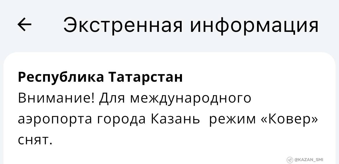 🚨 Режим «Ковер» снят в аэропорту Казани Все ограничения на прием и выпуск ВС сняты в казанском аэропорту. #город@kazan_smi 👍 Подписаться на канал ПЛАТИМ ЗА ЭКСКЛЮЗИВНЫЕ КАДРЫ