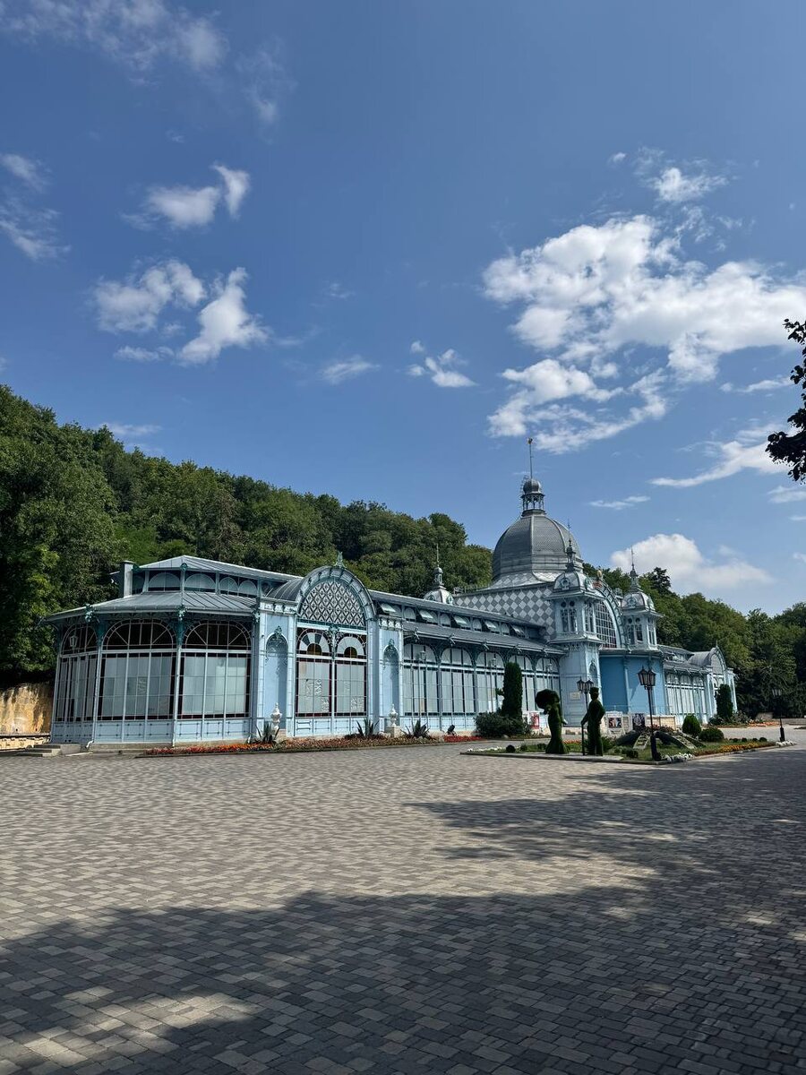 Что понравилось (если не обращать внимание на усталый вид): как в этих зданиях сочетается утилитарность курортных павильонов и утонченность художественных решений. Каждая арка, каждая башенка — не случайна. Здесь нет лишних деталей, но есть чувство праздника, вплетённого в саму структуру стен.