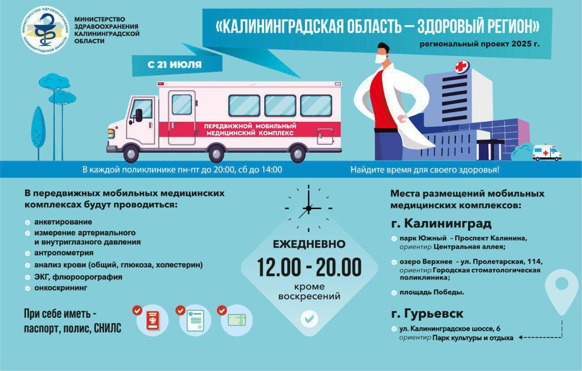 ➕Друзья, напоминаем, что в регионе начат проект выездной диспансеризации🚌 👍Министерство здравоохранения проводит масштабный проект «Калининградская область – здоровый регион». 🌞До конца лета ежедневно с 12.00 до 20.00 (кроме воскресенья) жители Калининграда могут пройти обследование в рамках профилактического медицинского осмотра и диспансеризации внутри передвижных медицинских комплексов, расположенных по следующим адресам: ✔️площадь Победы; ✔️Верхнее озеро (ул. Пролетарская, 118 а ориентир – Городская стоматологическая поликлиника); ✔️Южный парк (проспект Калинина, ориентир – Центральная аллея). ✔️В Гурьевске передвижной комплекс находится по адресу: ул. Калининградское шоссе, 6 (ориентир – Парк культуры и отдыха). 📌Также, на территории всех муниципальных округов региона, в поликлиниках кабинеты диспансеризации работают по будням до 20.00, в субботу – с 9.00 до 14.00.
