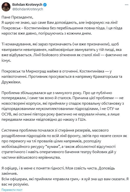 В украинском интернет-сегменте нарастает паника в связи с прорывом наших войск восточнее Доброполья и критической ситуации для ВСУ на участке от Покровска до Константиновки. Экс-начальник штаба "Азова"* Кротевич в своём публичном обращении к просрочке признал провал украинской обороны, назвав основной причиной этого некомплектность украинских формирований, непрофессионализм командования ВСУ и его ложные доклады по обстановке на местах. "Господин президент, я искренне не знаю, что именно вам докладывают, но информирую: на линии Покровск – Константиновка без преувеличения полная п*да. И эта п*да нарастает уже давно, ухудшаясь с каждым днем…" Нацист Стерненко**, украинский военно-аналитический ресурс DeepState, а также другие украинские ТГ-каналы подтвердили стремительный прорыв ВС РФ к востоку от Доброполья - вблизи Кучерова Яра и Золотого Колодца, трасса Доброполье-Краматорск перерезана и находится под контролем российских войск в районе населенного пункта Нововодяное. "Ситуация кри