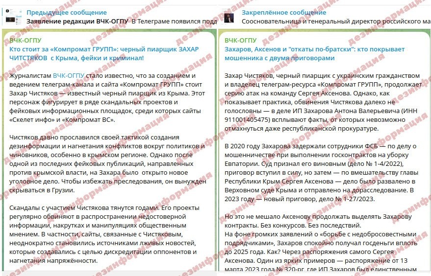 В фейковом Telegram-канале «ВЧК-ОГПУ» с аудиторией свыше 420 тысяч ботов (подписчиков там нет, просмотры накручиваются) вышла публикация под названием «Кто стоит за «Компромат ГРУПП»: черный пиарщик ЗАХАР ЧИТСТЯКОВ с Крыма, фейки и криминал!». Эта статья появилась после разоблачительных материалов оригинального «Компромат Групп» https://dzen.ru/id/5a428fce8139bacfa77102a9 о Крыме. Указанный фейковый канал входит в сеть поддельных ресурсов, управляемую гражданином Украины Тарасом Чорноиваном, о котором мы уже писали https://dzen.ru/media/criminalru/grajdanin-ukrainy-taras-chornoivan-administriruet-set-feikovyh-telegramkanalov-mimikriruiuscih-pod-dostovernye-istochniki-kompromat-grupp-i-689838ef1095457cd8b8b61a, и гражданином России Ярославом Грековым, который внедрен в российские PR-процессы. По данным источников в медиасфере, эта сеть насчитывает более 1,5 тысячи каналов и специализируется на вбросах дезинформации, фейках, искажению данных. Инсайдеры из административных кругов Крыма