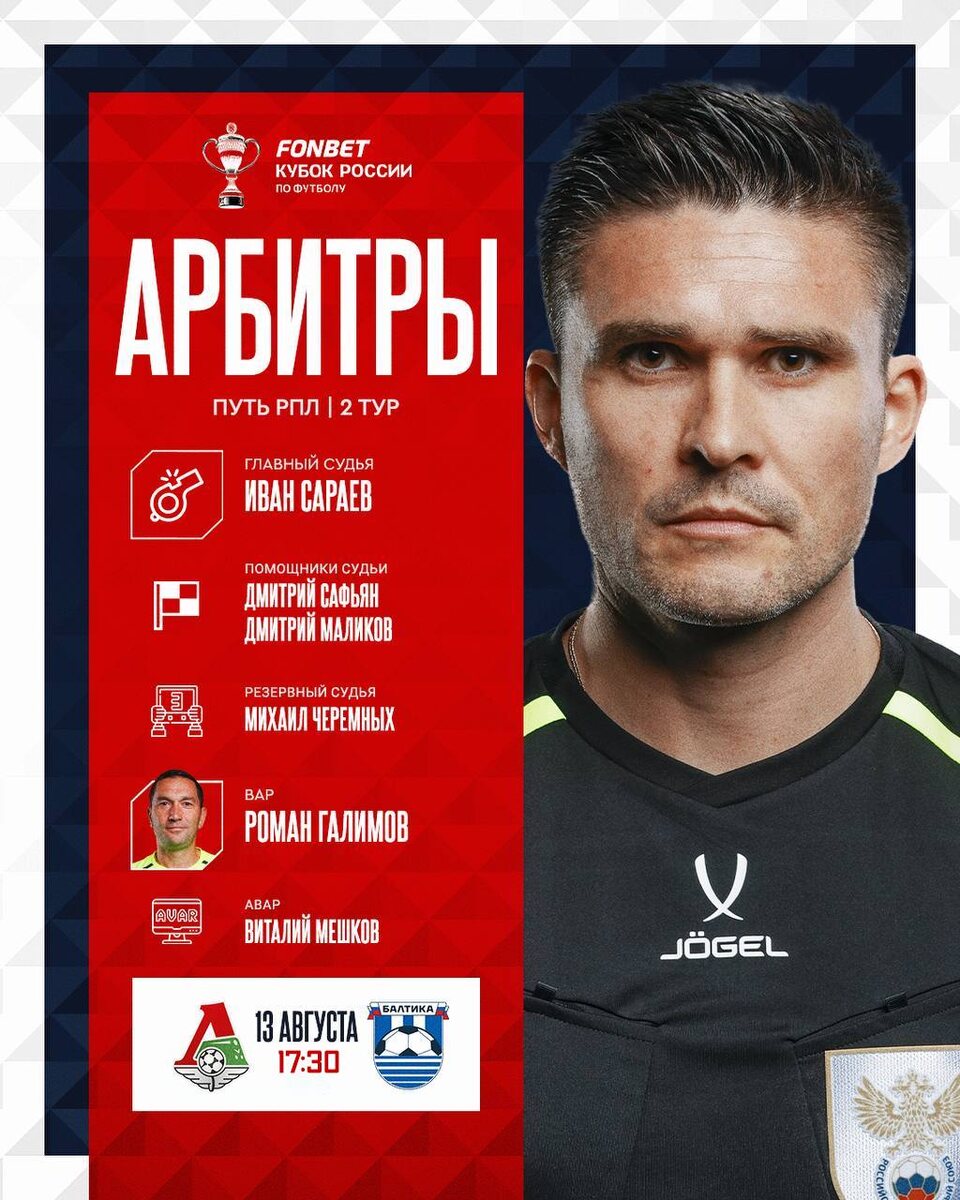 На матч второго тура группового этапа Пути РПЛ FONBET Кубка России назначена следующая бригада арбитров: 🚩 Главный арбитр матча — Иван Сараев 🏳 Ассистенты судьи — Дмитрий Сафьян, Дмитрий Маликов 📺 VAR — Роман Галимов 👀 AVAR — Виталий Мешков ✍🏻 Инспектор – Вячеслав Харламов В качестве главного судьи Иван Владимирович работал на четырех матчах «Балтики», в которых наша команда единожды одержала победу и два раза сыграла вничью. В этих встречах было показано восемь желтых карточек.