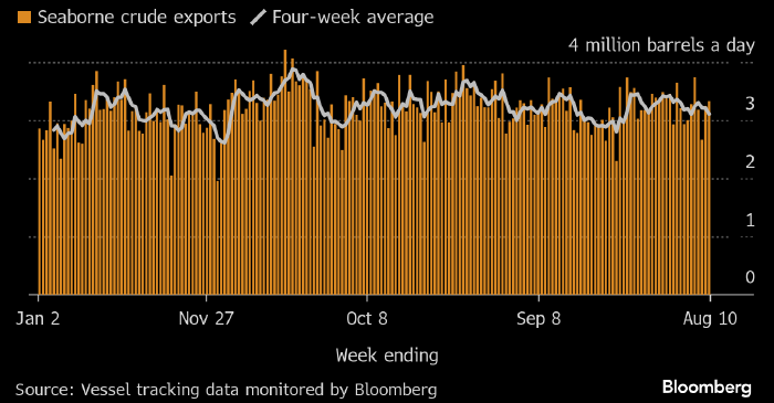 На фоне 25-процентных тарифов индийские государственные НПЗ частично переключили покупки нефти на нероссийские источники. Однако реальное влияние данного фактора на российский экспорт нефти можно будет оценить только через несколько недель, пишет Bloomberg. Оранжевым — морской экспорт нефти из РФ, серым — среднее четырехнедельное значение (млн б/д). Источник: Bloomberg Морской экспорт нефти из РФ снижается уже три недели подряд (среднее четырехнедельное значение — прим.), однако остается в привычном диапазоне текущего года, пишет Bloomberg со ссылкой на данные по движению судов. Таким образом, угрозы Трампа ввести дополнительные тарифы против покупателей российского черного золота пока не возымели значимого эффекта. По данным агентства, на протяжении четырех недель до 10 августа Россия в среднем экспортировала по морю 3,11 млн б/д. Это примерно на 3% меньше, чем на протяжении четырех недель до 3 августа, однако показатель в базе неделя к неделе немного подрос на неделе до 10 августа. Н