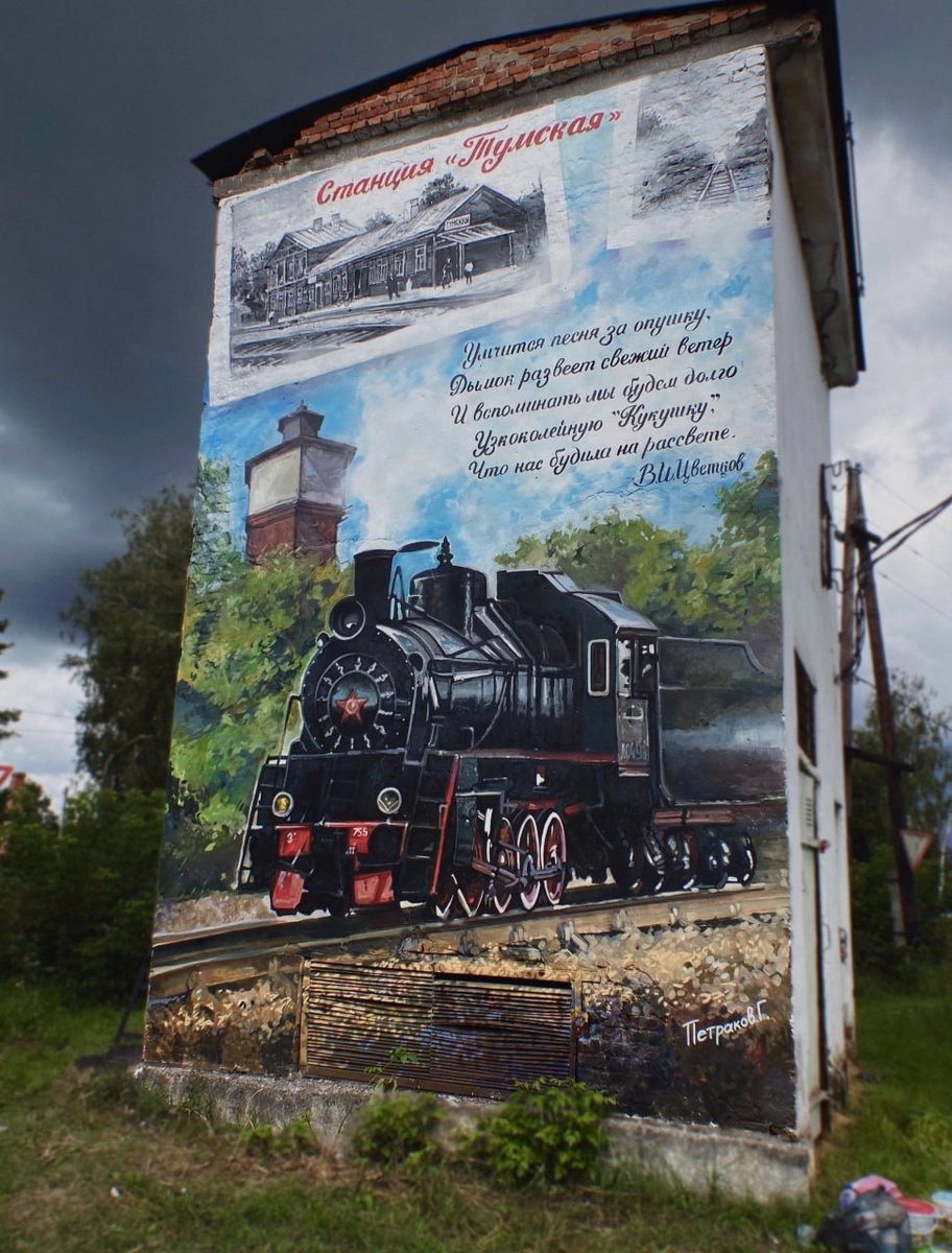 «Раскрасил Туму. Над эскизом начал работать ещё в июне, было большое желание сделать вид раскрытой книги с красивой обложкой, посвящённой Тумскому вокзалу и строкам Паустовского. Работу выполнил от и до кистями, было жарко, но желание написать картину было сильнее. Хочу сказать спасибо настоятелю Троицкого храма Михаилу Митрохину, храм, к слову, невероятно красиво расписан «масляными красками» внутри, и в целом людям за радушный приём».