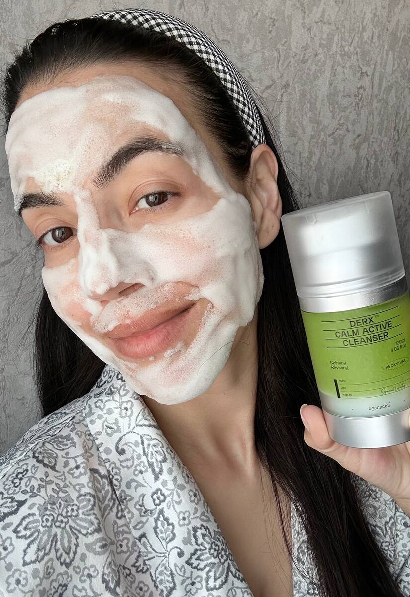 Правильное очищение лица является основой для здоровой кожи. Весь последующий уход будет гораздо эффективнее работать именно на хорошо очищенной коже. Утром использую мягкий очищающий гель или пенку, подходящую по типу кожи, чтобы смыть накопившийся за ночь себум и освежить кожу. Я в восторге от пенки OGANACELL DERX calm active. Она мягко, но очень эффективно очищает кожу не только от себума, но и от легкого макияжа и SPF. Ее можно использовать и в вечернее время.