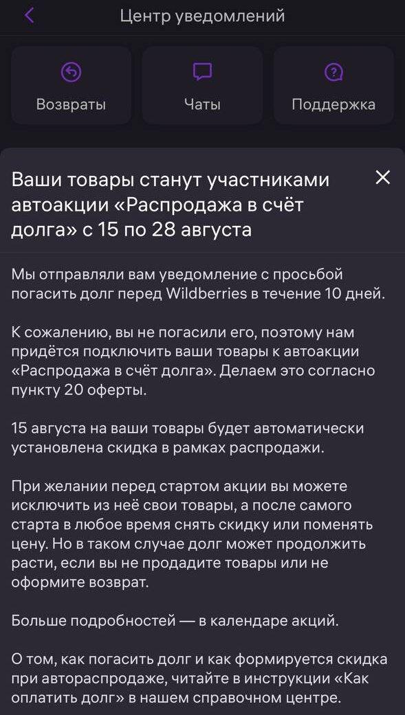 WB массово рассылает уведомления о «распродаже в счёт долга» Сегодня многие продавцы WB получили сообщение о том, что их товары автоматически подключат к акции «Распродажа в счёт долга» с 15 по 28 августа. Проблема в том, что у многих никакого долга нет. Надеюсь, это массовый сбой, а не реальная подготовка к распродаже под таким предлогом. Ждём официальных комментариев от WB. Marketplace_biz - отдай свой буст каналу