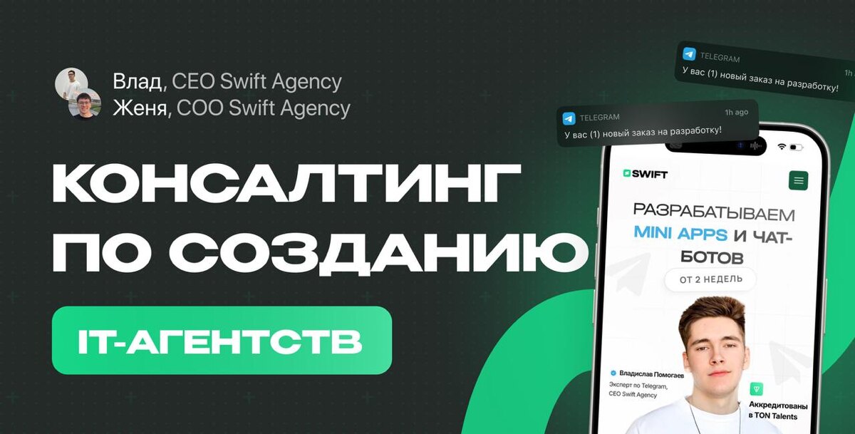 1️⃣ Запускаем консалтинг по созданию агентства с нуля Я — Влад, уже несколько лет в IT-бизнесе. Построил Swift Agency с нуля и знаю, как выстраивать продукт, команду и маркетинг Женя — эксперт по продажам в digital, закрыл десятки проектов и выстроил систему, которая работает Нам поступало много таких запросов, поэтому мы вместе запускаем обучение по построению агентства под ключ: — Поможем выбрать нишу и создать продукт — Упакуем: сайт, кейсы, оффер — Настроим маркетинг и продажи — Покажем, как нанимать и управлять командой — Как делать реально крутые результаты клиентам Мы сопровождаем тебя на каждом этапе — от идеи до первых стабильных клиентов Первая пробная консультация — бесплатно. Готов начать — пиши 👉 @swift_manager