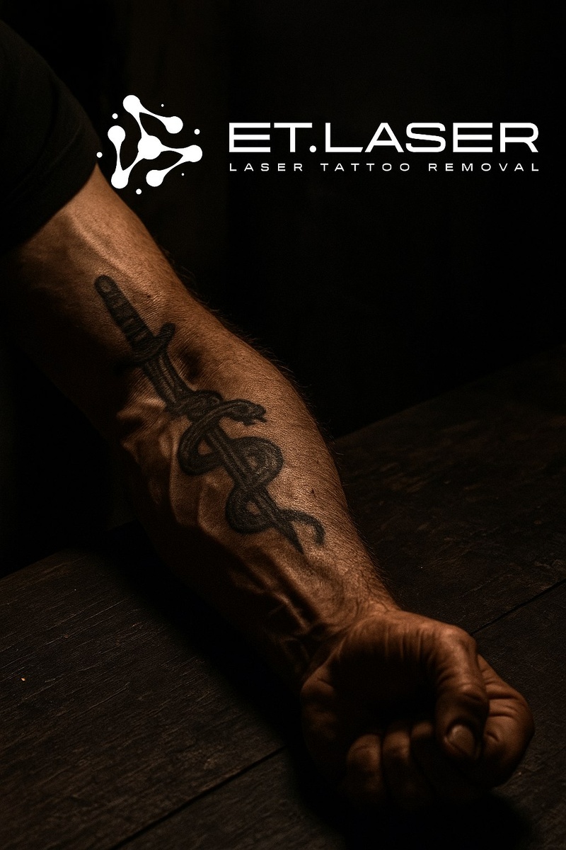 На первый взгляд — просто красивая композиция. На деле — опасный символ, особенно в тюремной культуре. Значение в криминальном мире Кинжал, обвитый змеёй — знак умышленного убийства. Часто — против человека из силовых структур. Где набивают Чаще всего — на пальцах или руках, чтобы было видно. Это демонстрация силы и готовности к агрессии. Почему опасно Даже если человек сделал такой рисунок просто ради эстетики, окружающие могут воспринять его иначе — особенно в местах, где знают значение наколок. Как себя вести Если заметили такую татуировку, держите нейтралитет, не провоцируйте и не задавайте лишних вопросов. 💡 Вывод: Если у вас есть татуировка с неоднозначным смыслом, её лучше удалить. Это убережёт от ненужных конфликтов и позволит выглядеть так, как вы хотите, а не так, как вас прочитают. Стирая опасные символы, вы стираете риск.