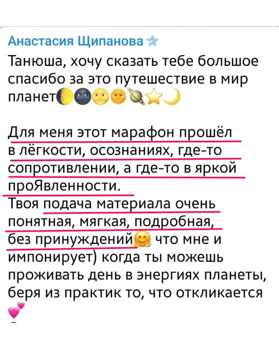 Вот и завершилась игра "АстроПрокачка" — «Астропрокачка» — это не скучная и сложная астрология, а простой и интересный способ познакомиться с планетами и почувствовать их энергию на себе. За время игры участницы проживали каждый день по-новому, наблюдали за собой и открывали в себе новые качества. 💎 Что особенно нравилось: — Всё объясняется просто, понятно и без давления. — Можно выбирать только те практики, которые откликаются именно тебе. — Есть понятный ритм — 2 практики в день держат в тонусе, но не перегружают. — Много полезных знаний из разных направлений, которые реально можно применять в жизни. — Тёплая и дружелюбная атмосфера, где хочется делиться своими ощущениями. 💎 Что получили участницы: 1. Поняли больше о себе — научились слушать себя, доверять интуиции, чётче понимать свои состояния. 2. Стали смелее — начали чаще проявляться, идти на общение. 3. Нашли баланс — с некоторыми планетами уже в гармонии, а с другими теперь знают, как работать. 4. Стали спокойнее